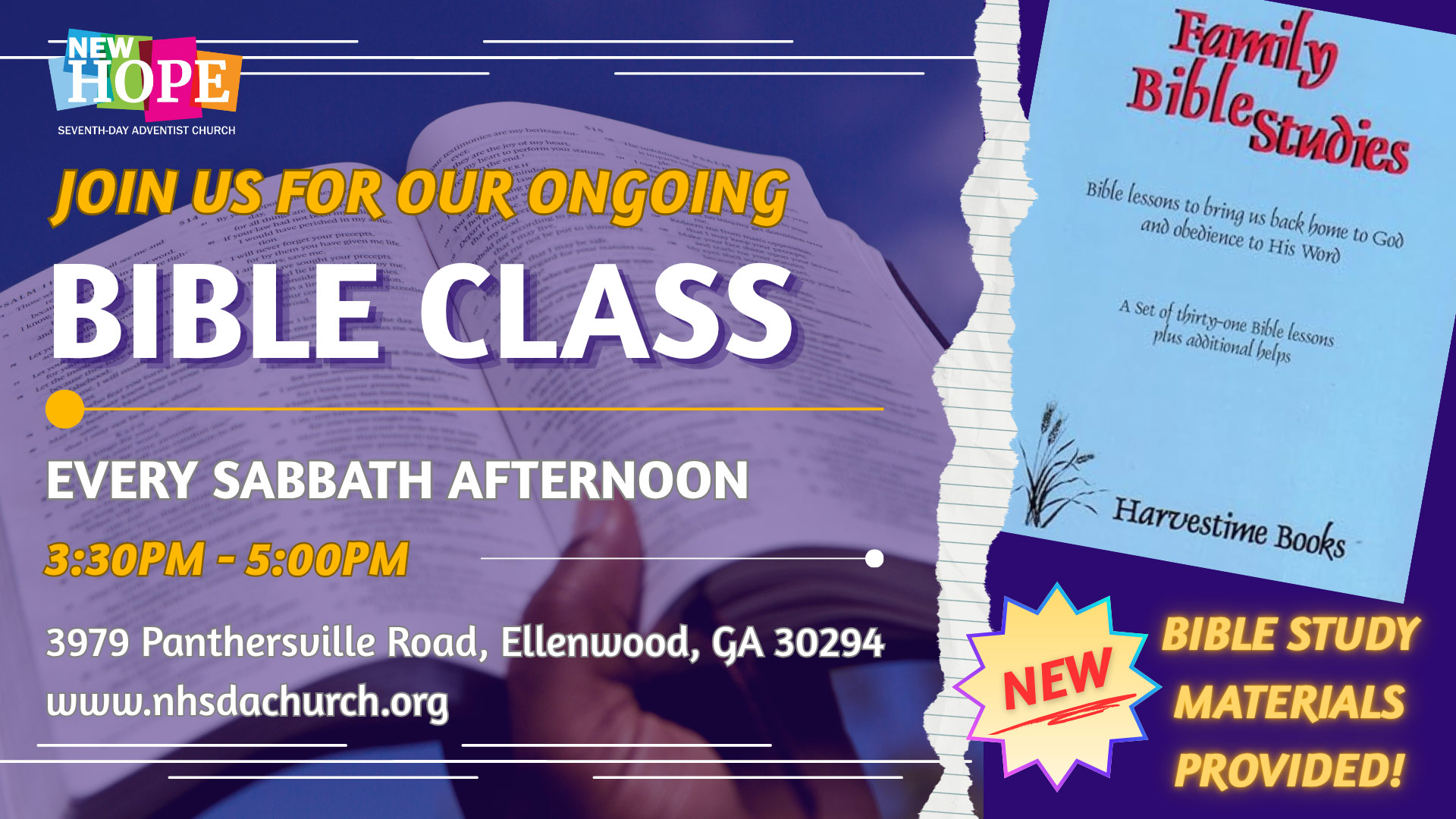 Join us every Sabbath afternoon at 3:30 p.m. as we explore the Word of God in a simple, clear, and life-changing way. These Bible studies are designed to deepen your understanding of Scripture, strengthen your faith, and draw you closer to Jesus Christ.
